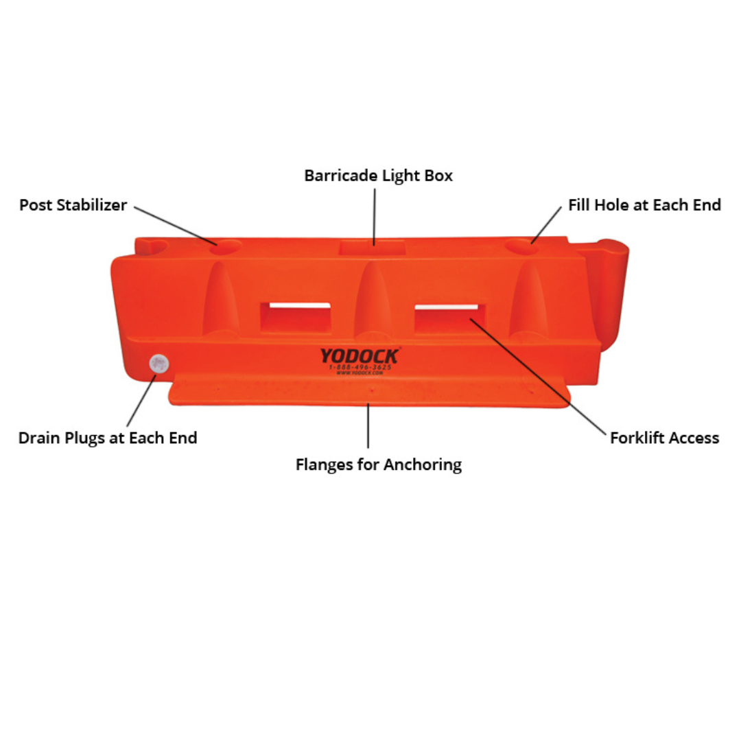 Comprised of Recyclable, Portable Energy Disbursement CellsThe 2001SL Barricade is comprised of recyclable, portable energy disbursement cells, molded to ensure water tightness and integrity. The 2001 Slimline is manufactured with internally molded baffles in order to maintain its shape, be properly sealed, and leak resistant. The provided drain plugs, one located on each side and underside grooves to allow for flow of surface drainage. The Yodock SL can also be filled with foam material. The unit is joined by a unique coupling system that provides a positive interlock while allowing for approximately 22 degrees of articulation between the units. The unit has ports designed to allow for ground mounting and forklift holes for ease of mobility when filled.