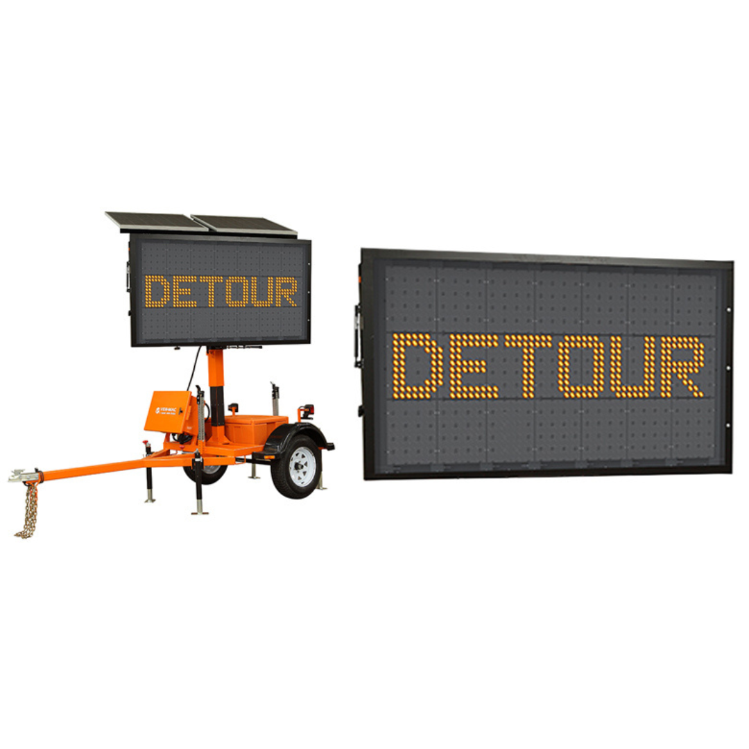 Ver-Mac’s PCMS-548 Pro is a mini full-matrix trailer-mounted portable changeable message sign. It features the NTCIP-compliant V-Touch controller, V-Sync Wi-Fi Communication, Stealth Technology, Tilt-and-Rotate solar panels, and JamLogic fleet management Software. The PCMS-548 Pro combines energy-efficient design and high-quality construction to provide the most reliable and cost-effective message sign on the market. It is the perfect model for lower speed roadways and urban areas.